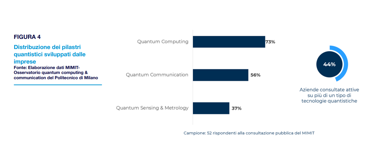 Il panorama nazionale è particolarmente vivace sul fronte delle aziende e startup italiane, che si concentrano in modo preponderante sullo sviluppo di software per la computazione quantistica e su hardware e software per le comunicazioni e la sensoristica.