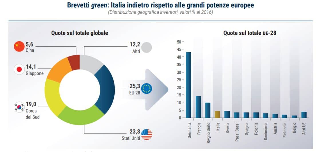 Resta ancora un punto dolente, tuttavia, dei brevetti green: secondo dati OCSE, infatti, in questo ambito l’Italia occupa ancora un ruolo marginale in Europa, con un peso (4,6%) che è simile a quello della Svezia ed è circa un terzo di quello francese e la metà di quello del Regno Unito.