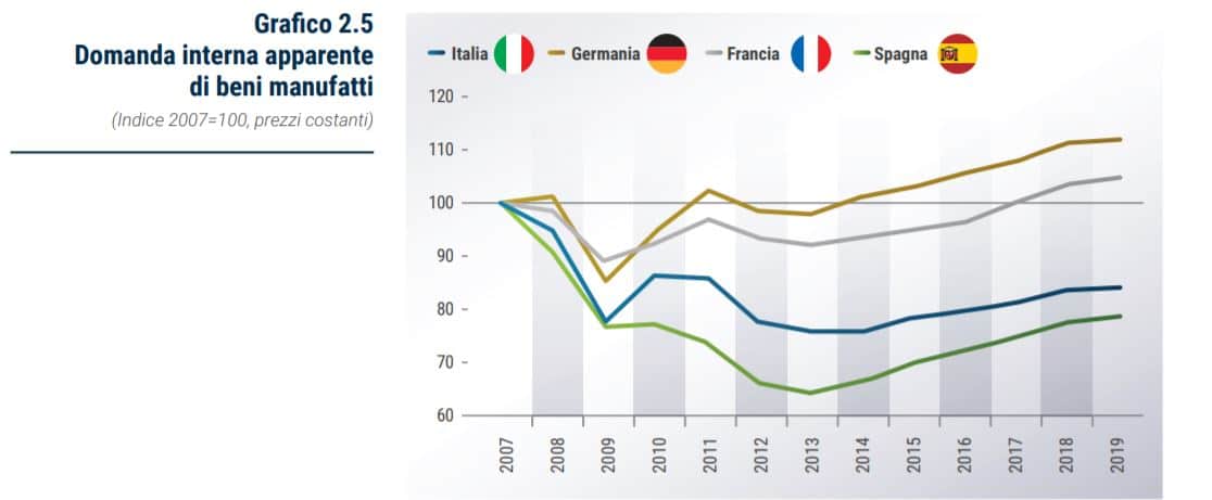 A questo proposito, si stima che alla fine del 2019 la domanda interna di beni manufatti italiani fosse inferiore del 16% ai livelli del 2007, contro il +4,8% in Francia e il +11,9% in Germania. Il terzo risultatto peggiore nell’Eurozona, dopo Grecia (-24,6%) e Spagna (-21,6%).
