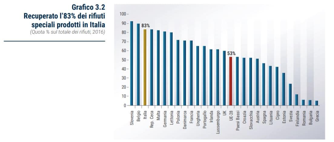 Per quanto concerne la sfida alla sostenibilità, l’Italia parte da una posizione avvantaggiata, avendo già da tempo introdotto un approccio “responsabile” alla produzione e al consumo di risorse. Presenta, infatti, un ridotto impatto in termini di rifiuti solidi prodotti, grazie ad un approccio circolare rispetto all’utilizzo delle risorse (grazie alle attività di riciclo e recupero è stato infatti possibile re-immettere nel sistema economico l’83% circa dei rifiuti speciali prodotti in Italia, contro l’81% registrato in Germania, il 71% in Francia, il 60% del Regno Unito e una media UE del 53%).