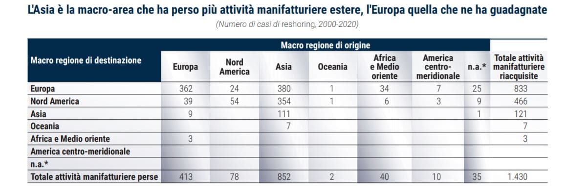 Processi che hanno portato l’Asia ad essere il continente che ha perso più attività manifatturiere negli ultimi 20 anni, a favore soprattutto dell’Europa (dove si è registrato il 58% del reshoring a livello globale).