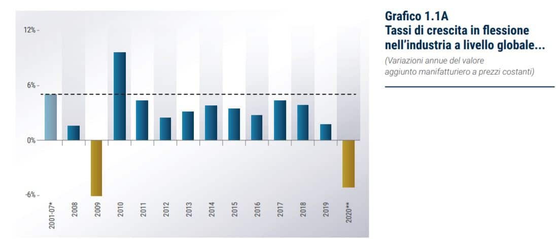 La pandemia ha provocato uno shock del settore manifatturiero a livello globale, che si è inserito in un contesto che già risentiva dei cambiamenti dell’ultimo decennio. Il tasso di crescita della produzione industriale, infatti, ha subito una flessione negli ultimi 10 anni, con la crescita del valore aggiunto a livello mondiale pari all’1,8% nel 2019 (in decelerazione per il secondo anno consecutivo), con livelli simili alla situazione post-crisi del 2008.