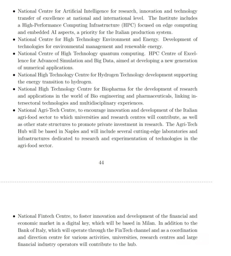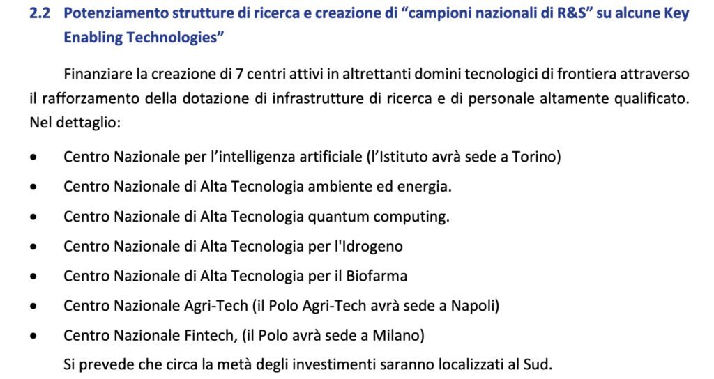 Qui, nel secondo intervento della componente Dalla ricerca all’impresa (M4C2, intervento 2) si riportavano esplicitamente Napoli e Milano come sedi del centro per l’AgriTech e per il FinTech e Torino come sede del Centro per l’Intelligenza Artificiale
