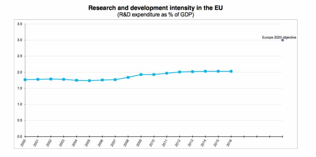 Gli investimenti dell’Europa in ricerca e sviluppo sono inferiori alle potenze con cui Bruxelles si confronta. Nel 2015 la Corea del Nord ha speso il 4,23% del suo prodotto interno lordo. Il Giappone viaggia intorno al 3,29%, gli Stati Uniti al 2,79%. Anche la Cina, seppure di poco, ha sorpassato la Ue, attestandosi l’anno scorso al 2,07%. La Commissione ha posto come traguardo una media del 3% entro il 2020 e ha indicato questo traguardo tra i cinque principali obiettivi della strategia pluriennale dell’Unione. All’attuale velocità di crescita è un risultato che non potrà raggiungere.