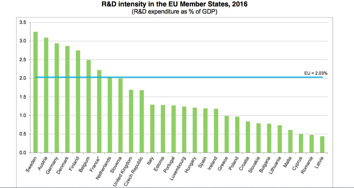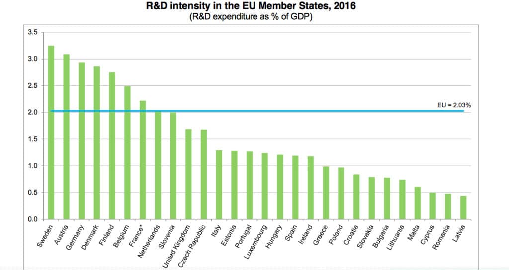 Negli ultimi dieci anni la spesa è cresciuta in ventidue Paesi membri. L’Austria ha investito più di tutti in ricerca e sviluppo, passando dal 2,36% del 2006 al 3,09% del 2016. Al contrario, sei Paesi hanno ridotto i loro contributi, su tutti la Finlandia, che dal 3,34% di dieci anni prima nel 2016 è scesa al 2,75%, comunque al di sopra della media comunitaria. Quasi tutti gli Stati hanno collocato le loro provviste sul segmento delle imprese, salvo Cipro, Lettonia e Lituania, che hanno finanziato l’educazione superiore.