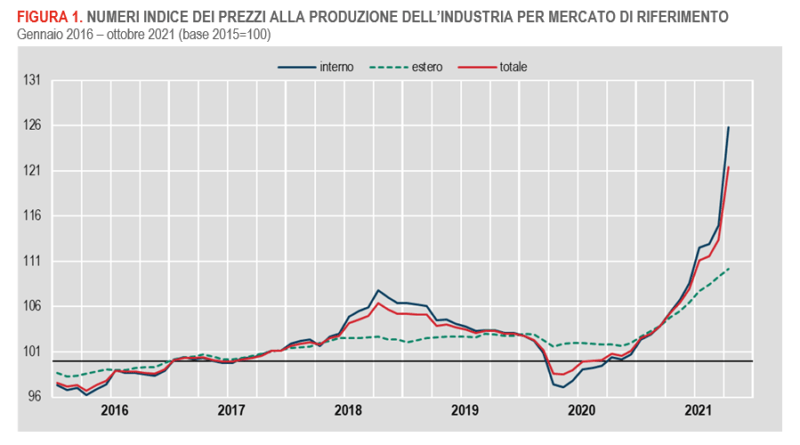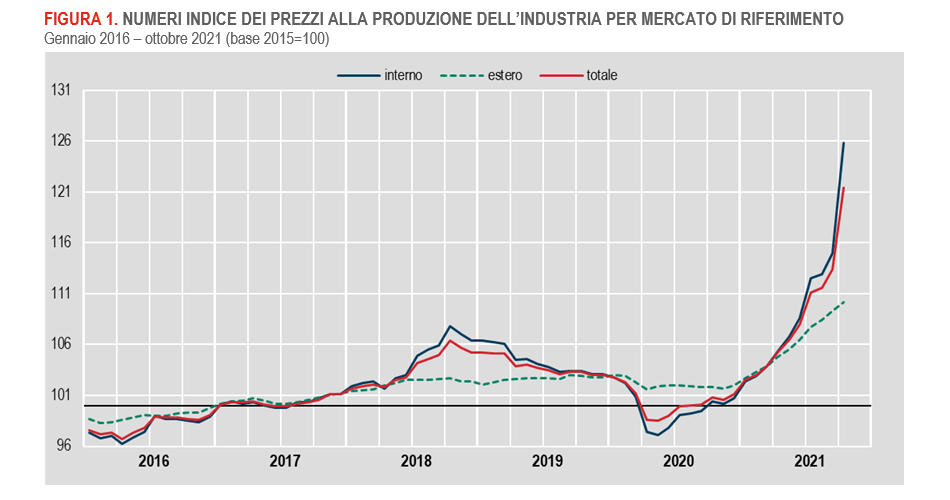 Nel trimestre agosto-ottobre 2021, rispetto ai tre mesi precedenti, i prezzi alla produzione dell’industria crescono del 6,5%, con una dinamica decisamente più sostenuta sul mercato interno (+7,9%) rispetto a quello estero (+2,5%).