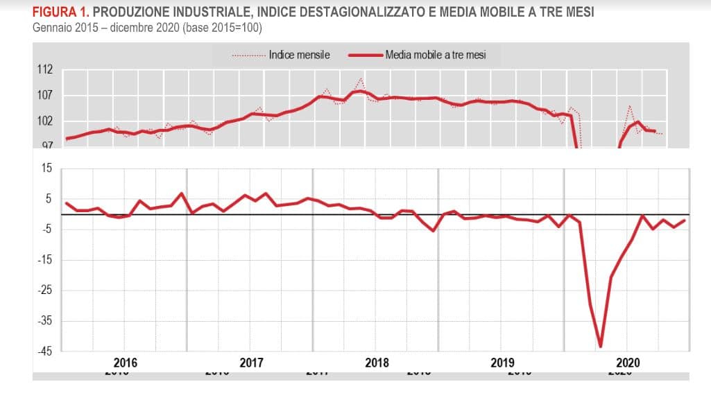 Per quanto concerne l’indice destagionalizzato, si notano gli effetti della battuta di arresto della produzione successiva al progressivo recupero dopo i mesi di marzo e aprile 2020: nella media del quarto trimestre l’indice destagionalizzato è, infatti, ancora inferiore del 3,1% rispetto a febbraio 2020, con una flessione dello 0,8% rispetto al trimestre precedente e dello 0,2% rispetto a novembre 2020.