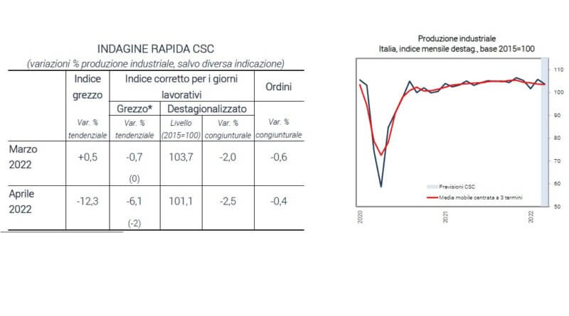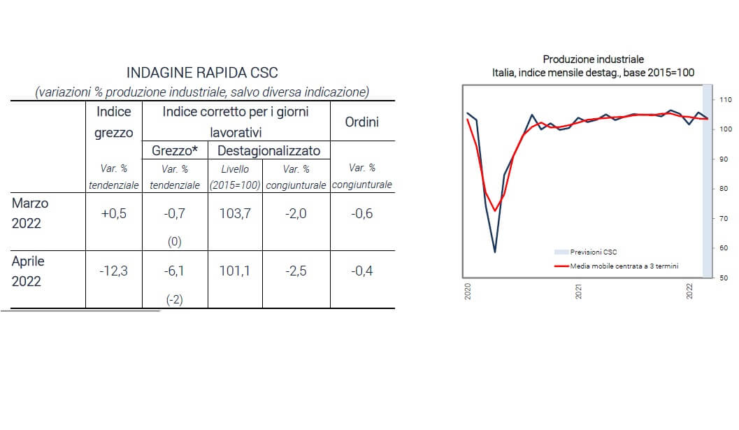 Il Centro Studi Confindustria stima un calo del 2% della produzione industriale italiana a marzo e del 2,5% ad aprile, numeri che fanno seguito al rimbalzo di febbraio (+4,0%) e alla caduta a dicembre di gennaio (-3,4%) e dicembre (-1%).
