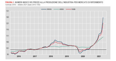 Dall’analisi tendenziale – quindi confrontando i valori di ottobre 2021 con quelli registrati ad ottobre 2020 – si registrano incrementi tendenziali per i beni intermedi (+3,4%), i beni di consumo (+2,7%) e l’energia (+1,8%), mentre diminuiscono lievemente i beni strumentali (-0,1%).