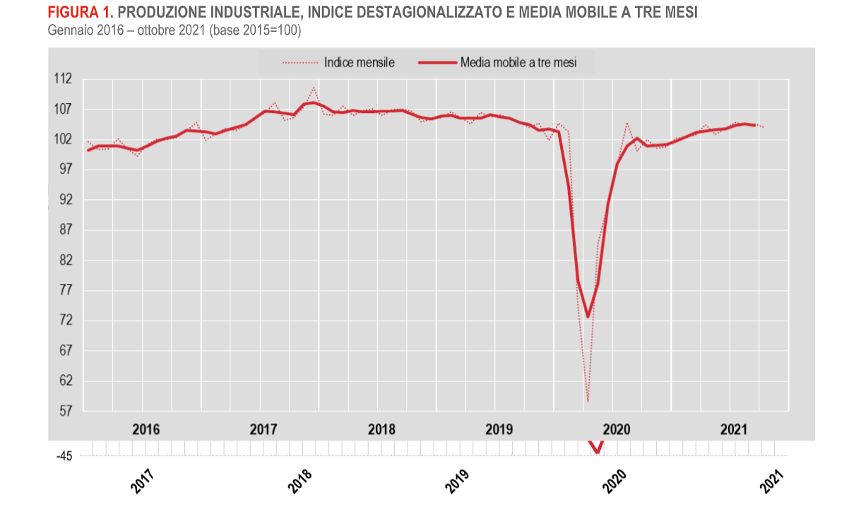 Al netto degli effetti di calendario, a ottobre 2021 la produzione aumenta su base annua del 2,0% (i giorni lavorativi di calendario sono stati 21 contro i 22 di ottobre 2020).