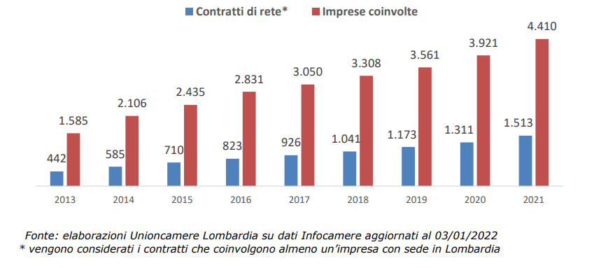 Il 2021 ha registrato un’accelerazione dei contatti di rete in Lombardia: oltre 700 imprese lombarde ne hanno sottoscritti nel corso dell’anno, in netta crescita rispetto agli ultimi anni. È quanto riporta il rapporto 2021 di Unioncamere Lombardia sui contratti di rete.