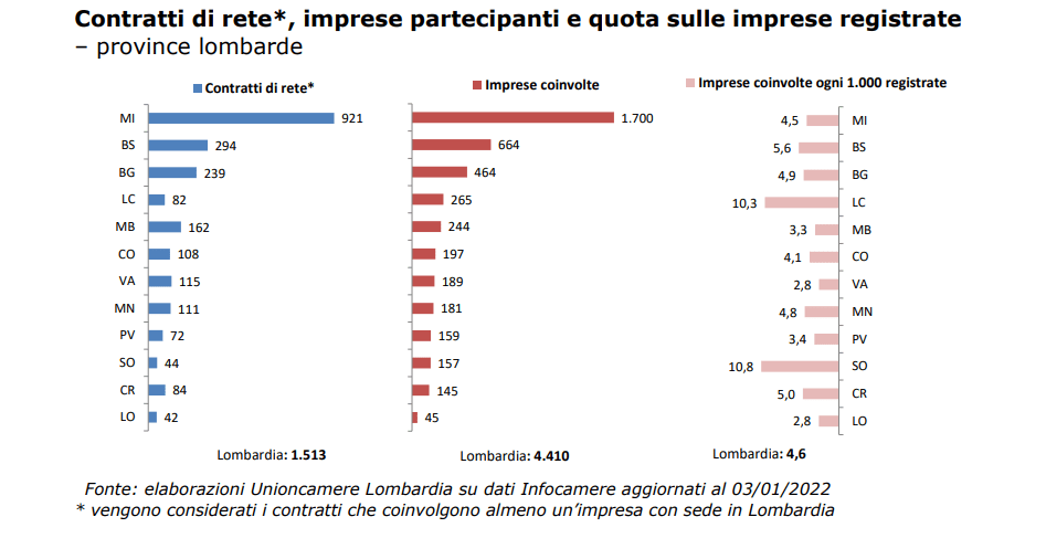 La Lombardia è la regione coinvolta nel maggior numero di contratti con 1.513 reti (il 20,4% del totale nazionale), ma la quota di imprese partecipanti è inferiore alla media italiana (7% delle imprese).