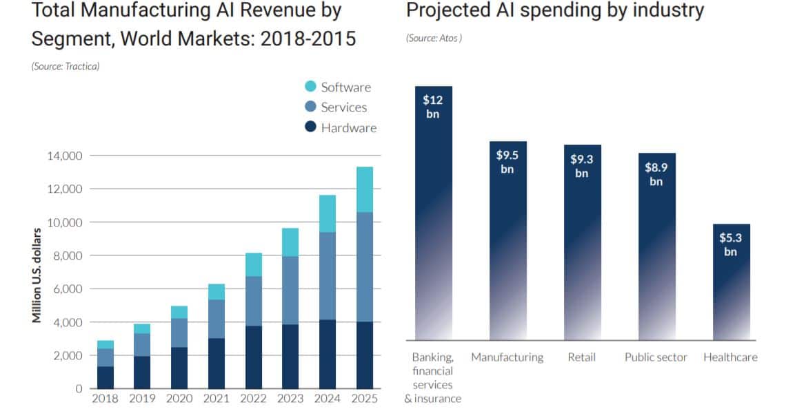 Il rapporto ha evidenziato l‘impatto dell’Intelligenza Artificiale sul settore manifatturiero: il settore, si stima, investirà in questa tecnologia 9,5 miliardi di dollari nel 2021 (sarà quindi il settore che investirà di più in IA, secondo solo al settore bancario e dei servizi finanziari ed assicurativi) e 13,2 miliardi di dollari entro il 2025.