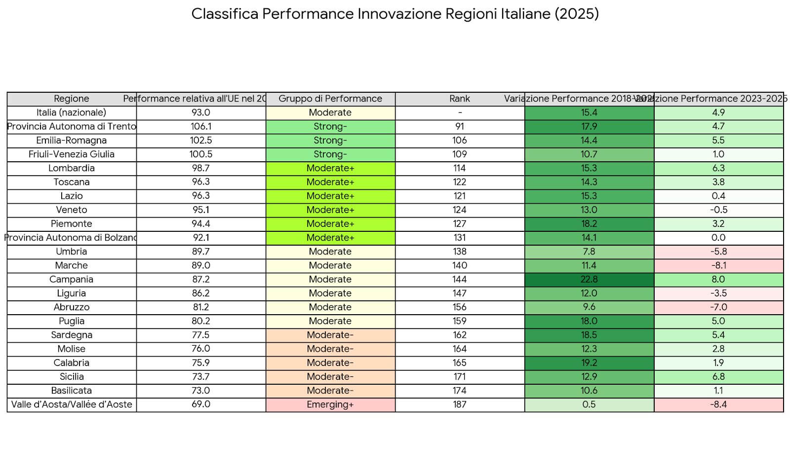L’Italia si conferma un Paese a due velocità sul fronte dell’innovazione, ma con segnali di convergenza che arrivano dal Mezzogiorno. È questa la fotografia scattata dal Regional Innovation Scoreboard 2025, il rapporto della Commissione Europea che mappa le performance dei sistemi di ricerca e sviluppo nel continente.