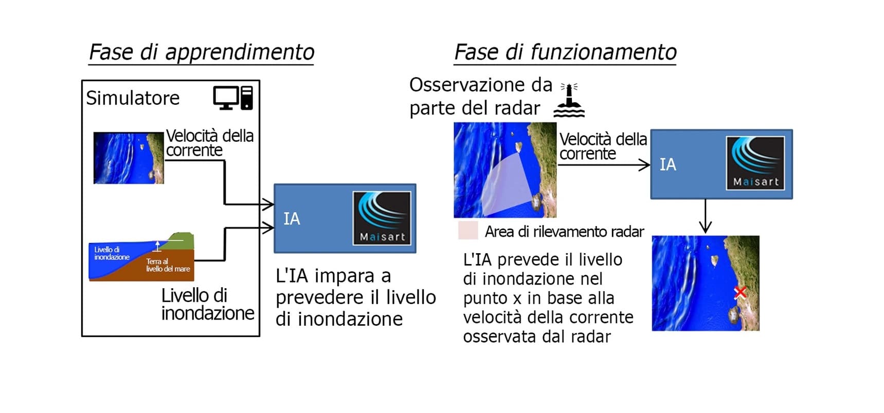 La previsione accurata dei livelli di inondazione richiede informazioni sulle correnti oceaniche superficiali su un’area ampia. Dopo aver confermato che tali informazioni potevano essere raccolte entro un raggio massimo di 50 km utilizzando speciali dispositivi radar, Mitsubishi Electric ha sviluppato la tecnologia necessaria.4 La nuova tecnologia radar è stata quindi combinata con la tecnologia di IA Maisart di Mitsubishi Electric per consentire previsioni estremamente accurate5 del livello di inondazione dell’acqua in pochi secondi.