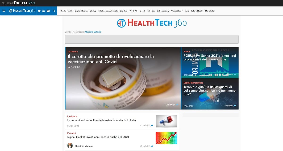 “La tecnologia sta rivoluzionando la medicina e il futuro della nostra salute – dice Massimo Mattone, direttore di HealthTech360 -. La crescita esponenziale delle tecnologie emergenti sta spingendo il mercato globale verso numeri che tratteggiano sin da ora il 2021 come il miglior anno di sempre per gli investimenti in salute digitale. Un’atmosfera di euforia che però deve fare i conti con la grande difficoltà di far comunicare tra loro gli attori di due mondi ancora distanti: medicina e tecnologia. HealthTech360 nasce con l’ambizione di favorire il cortocircuito vitale tra medici e tecnici, ricerca accademica e startup, istituzioni e imprese. Serve una visione olistica della salute ispirata alla condivisione della conoscenza e alla contaminazione tra competenze diverse”.