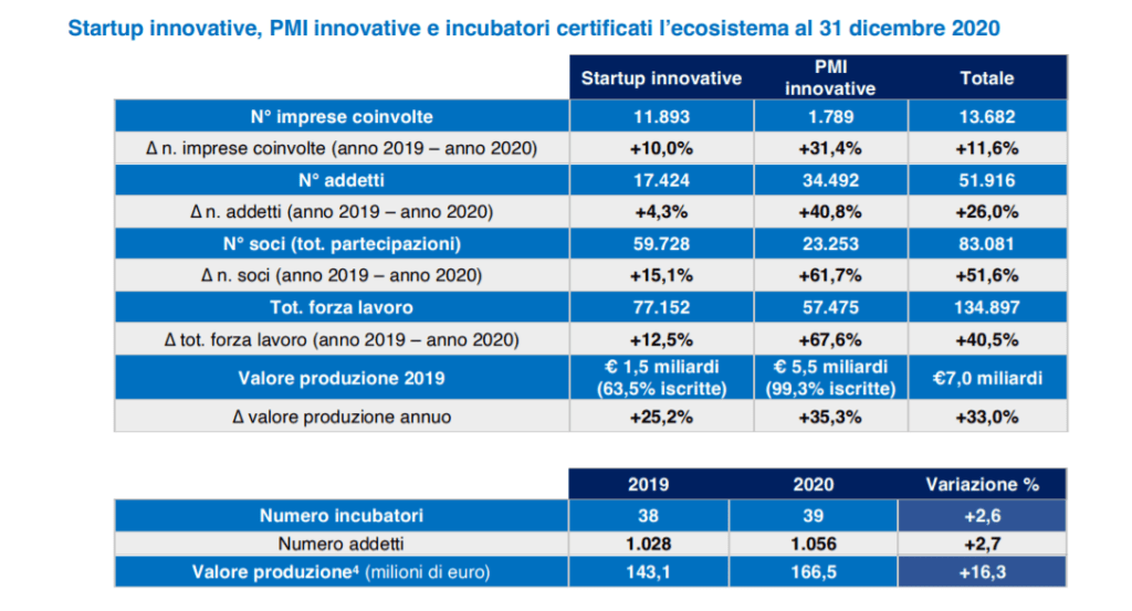I dati del 2021 confermando il buon risultato già ottenuto da startup e PMI innovative nel 2020, in cui il numero di iscrizioni nella sezione speciale del registro delle imprese era cresciuto rispetto al 2019 del 10% per le startup innovative e del 31,4% per le PMI innovative.