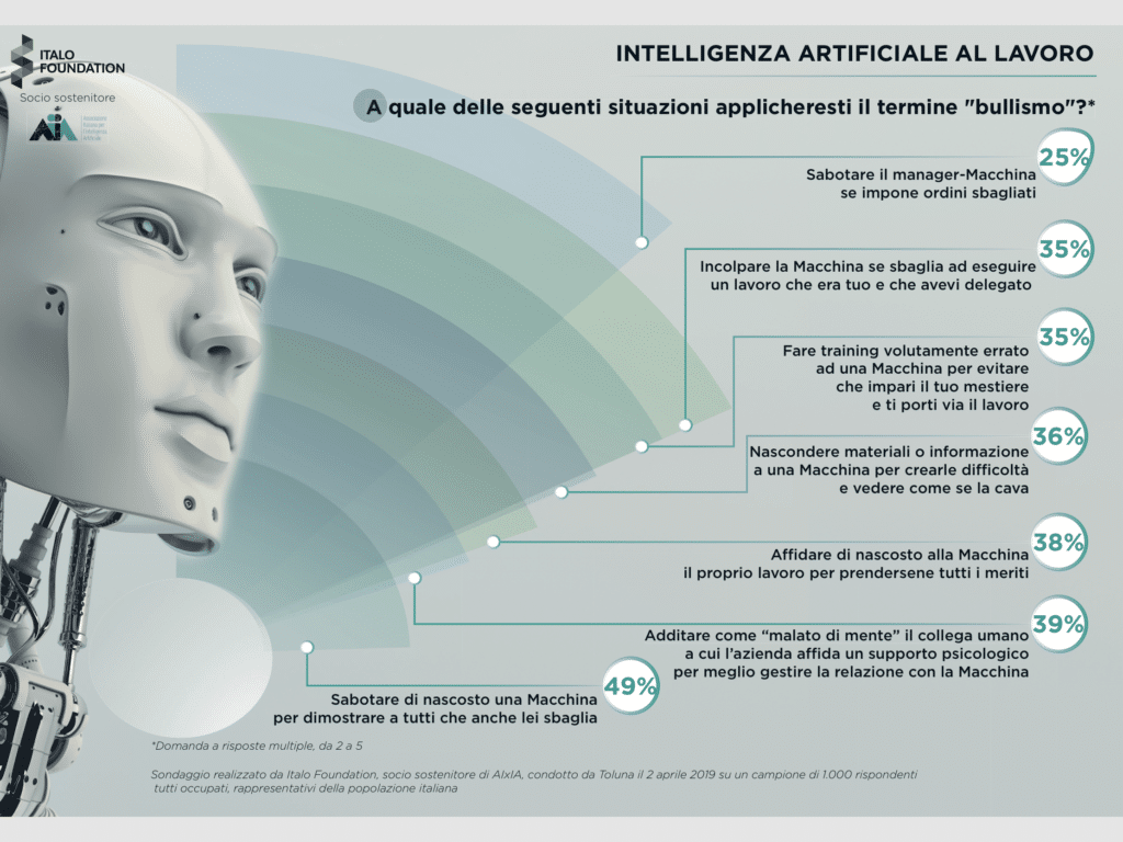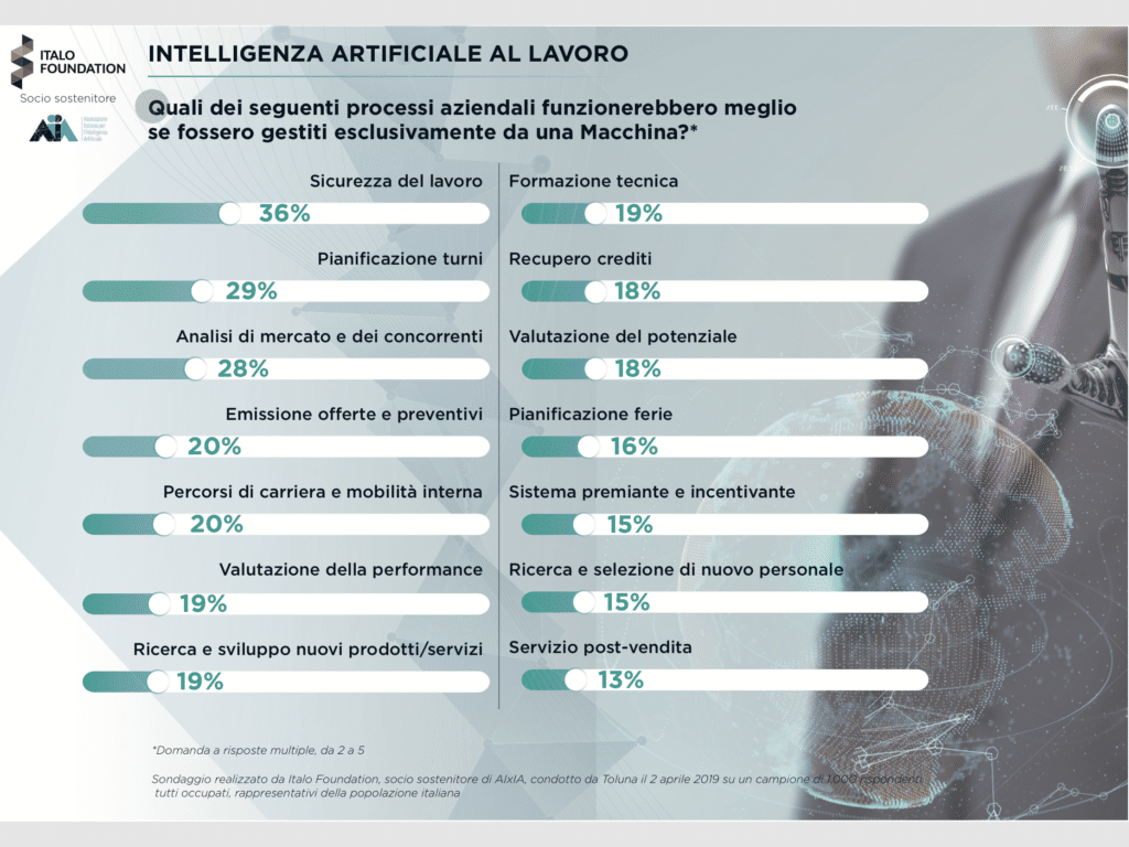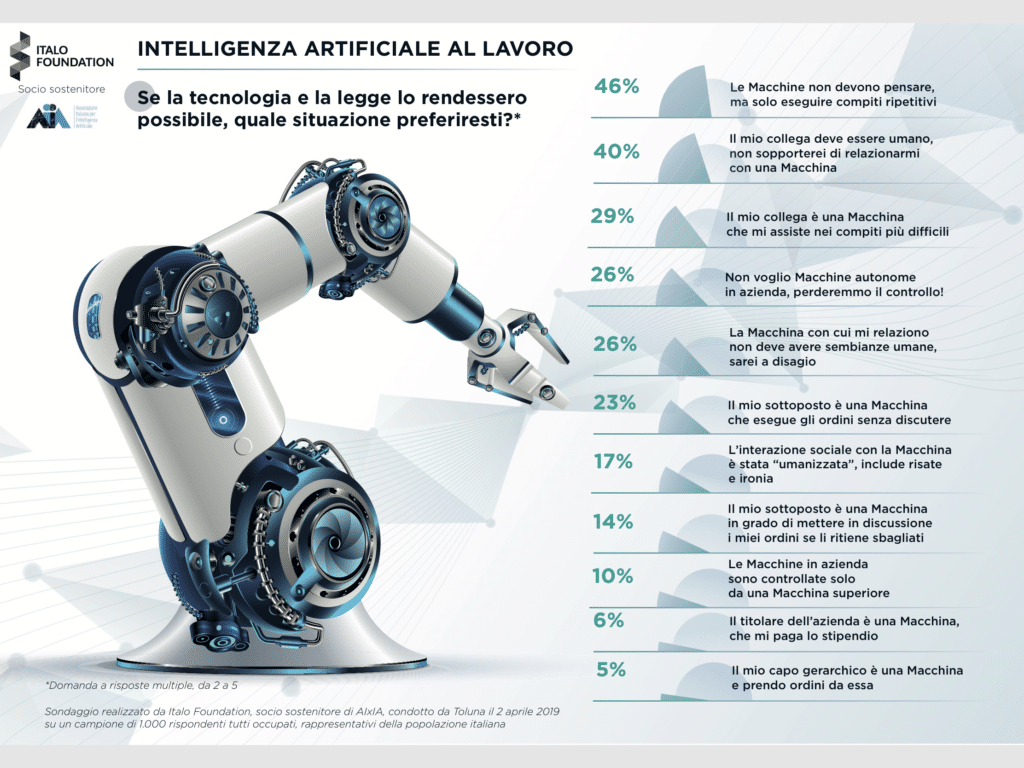 Sono dati particolarmente interessanti quelli emersi dalla ricerca ricerca “intelligenza artificiale al lavoro”: circa mille interviste lavoratori italiani rappresentativi della popolazione nazionale, che che la fondazione Italo ha commissionato a Toluna, società di ricerche di mercato, per analizzare l’impatto dell’introduzione di macchine intelligenti nel processo industriale per le risorse umane. La Fondazione ritiene infatti fondamentale comprendere gli effetti sul personale prima di introdurre in un ambiente lavorativo queste soluzioni artificialmente intelligenti per il solo ritorno economico.