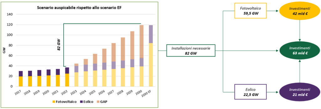 Lo scenario Elettricità Futura, invece, riporta un target più ambizioso, con una capacità installata al 2030 che sfiora i 120 GW: +82 GW rispetto al 2022, suddivisi in 59,5 GW di fotovoltaico e 22,5 GW di eolico