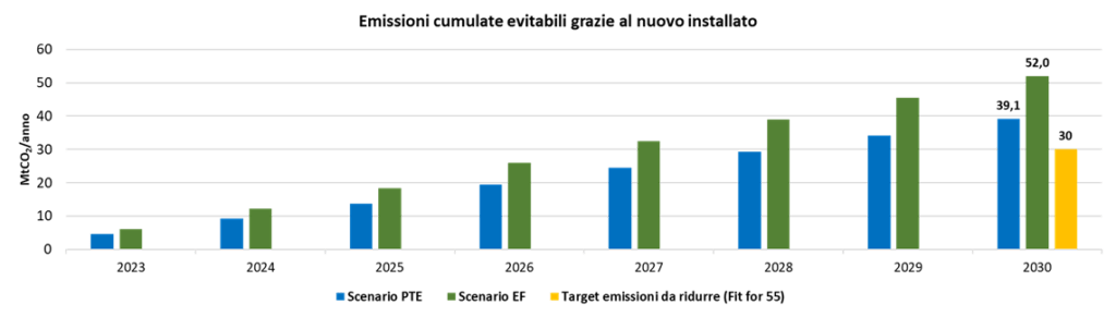 Al 2030, le emissioni evitabili grazie alle installazioni di impianti FER saranno comprese tra 39 e 52 MtCO2 l’anno, a seconda dello scenario considerato (PTE o EF), in ogni caso superiori al target del Fit for 55
