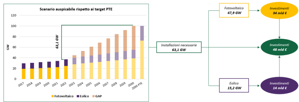 Lo scenario PTE, che può essere considerato la baseline di diffusione auspicabile, mostra come la quota di fotovoltaico ed eolico da raggiungere al 2030 sia pari a circa 100 GW. Tale scenario richiede l’installazione di capacità aggiuntiva per oltre 63 GW rispetto al 2022, suddivisi in circa 48 GW di fotovoltaico e 15 GW di eolico