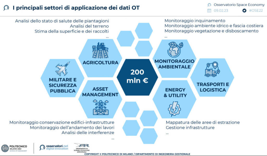 Il 65% del fatturato complessivo di questo settore è legato a enti pubblici nazionali o sovranazionali, Agenzie Spaziali ed Enti pubblici locali come Regioni, Province e Comuni. Il restante 35% è invece imputabile alla domanda proveniente da Grandi imprese, PMI e Startup che stanno per prime investendo in Osservazione della Terra. I principali ambiti di applicazione riguardano diversi settori: da agricoltura a silvicoltura e pesca, da energia a servizi di pubblica utilità, edilizia e infrastrutture. Da finanza, assicurazioni, comparto legale e ambiente a wildlife.