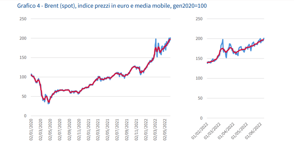 Tra gli energetici, infine, si distingue il petrolio Brent, il cui prezzo si caratterizza per una crescita continua e in accelerazione: il barile ha superato nei giorni scorsi quota 120$, portandosi su livelli doppi rispetto a gennaio 2020, e l’apprezzamento del dollaro nei confronti dell’euro ha contribuito all’aumento delle quotazioni in euro.