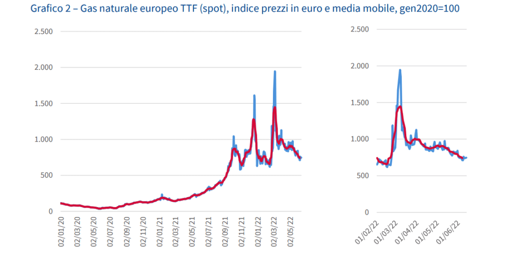 I prodotti energetici sono tra le materie prime che hanno registrato i maggiori rialzi nel recente passato. In particolare, il prezzo del gas naturale europeo, dopo il picco di inizio marzo intorno a 220 €/MWh, ha leggermente ritracciato attestandosi il 13 giugno a 83,4 €/MWh, oltre sette volte i livelli pre Covid e vicino ai valori registrati prima dello scoppio della guerra.