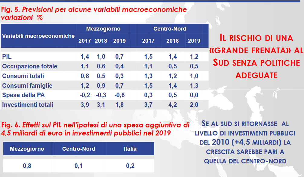 Si è passati quindi da una crescita del Pil nel Mezzogiorno dell’1,4% del 2017 (contro il +1,5% nel Centro-Nord) al rallentamento di quest’anno, quando la crescita del Sud dovrebbe fermarsi allo 0,8% mentre quella del Centro-Nord arriverà all’1,3%.