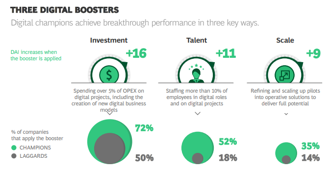 “Lo studio ha identificato tre booster a cui i più performanti si affidano per diventare più maturi digitalmente: spendono oltre il 5% dell’OPEX (spesa operativa) in progetti digitali, assegnano a ruoli e progetti digitali più del 10% dei propri dipendenti, sono più capaci di affinare e scalare progetti pilota in soluzioni operative” afferma Roberto Ventura, partner di BCG ed esperto Digital & Artificial Intelligence.