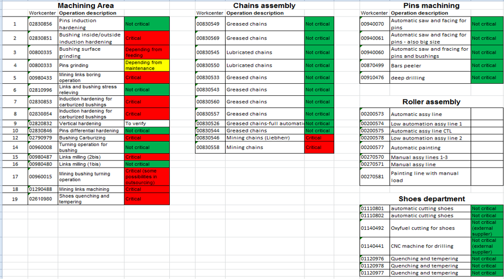 - La metodologia usata per l’individuazione degli asset critici basata su dati oggettivi, e non a sensazione, è stata la MCCE (Multicriterion Classification of Critical Equipment) che tiene conto di 10 parametri, compresi nelle tre funzioni interessate all’analisi (Produzione, Manutenzione e Qualità), fra cui la presenza di equipment con la stessa funzionalità a scorta calda (in lavoro ma non saturati) o a scorta fredda (momentaneamente non utilizzabili a causa di guasti o mancanza di personale), la possibilità di rifornirsi all’esterno e la mancanza/presenza di pezzi di ricambio facilmente reperibili sul mercato. ↑