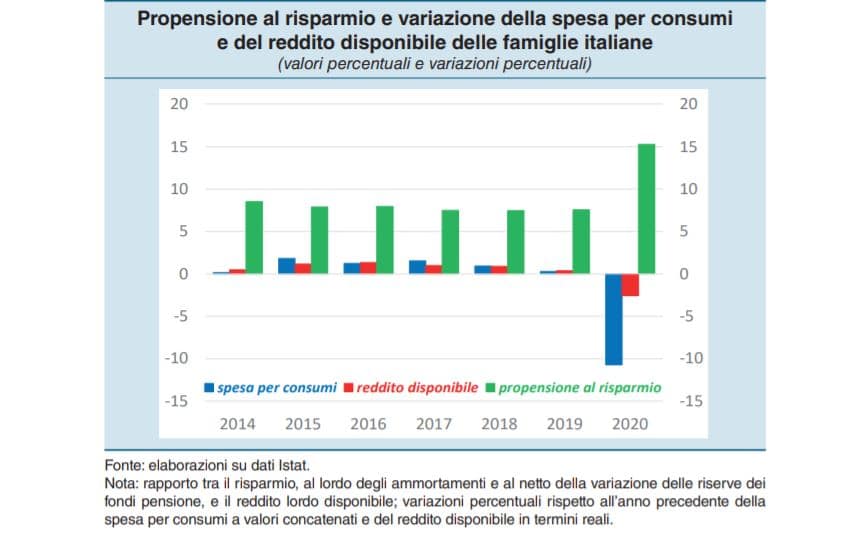 I consumi sono diminuiti del 10,7%, quattro volte più della riduzione del reddito disponibile, mentre la quota del reddito destinata al risparmio ha superato il 15%, il doppio rispetto al 2019.