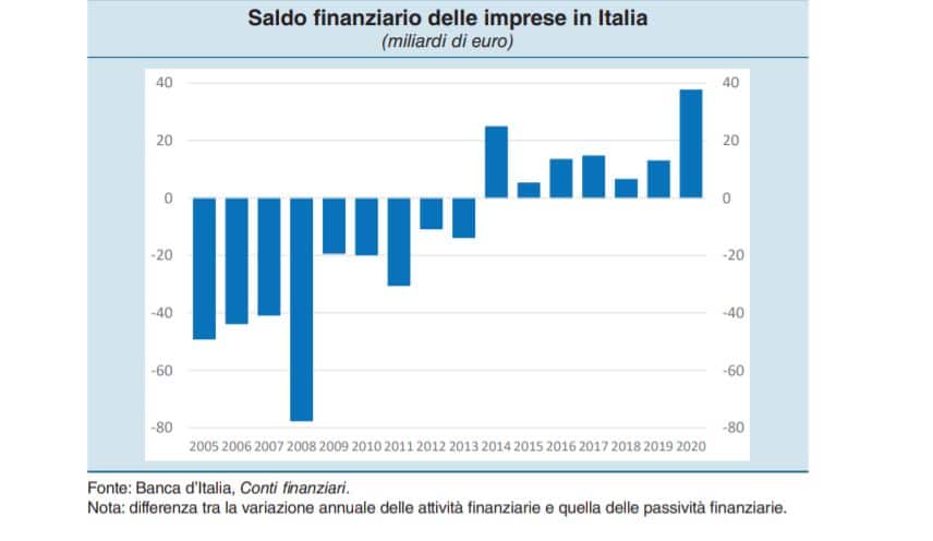 L’impatto delle misure messe in campo può essere visto anche dall’analisi del saldo finanziario del settore complessivo per il 2020 (ovvero la differenza tra la variazione delle attività e quella delle passività finanziarie), che è risultato positivo per 38 miliardi, tre volte il saldo finanziario dell’anno precedente.