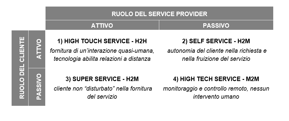 Self-Service – Human to Machine (H2M). Il ruolo attivo spetta solamente al cliente e la tecnologia offre un processo di tipo self-service. Il cliente, grazie all’interfaccia messa a disposizione dal provider o dalla sua rete di service (ad esempio, un’app dello smartphone), può interfacciarsi con la tecnologia e compiere in maniera autonoma delle operazioni: la presenza fisica del service provider non è richiesta. Un esempio chiarificatore è rappresentato dal tool di autodiagnosi presente nelle fotocopiatrici professionali, che attraverso immagini, istruzioni e semplici simboli guidano l’utente nell’autoriparazione del prodotto e nella sostituzione dei materiali di consumo.