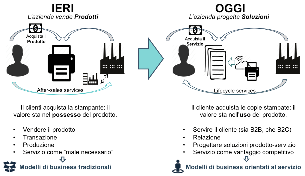 La quarta rivoluzione industriale oggi in corso (figura 1) è caratterizzata dalla fusione tra informazione digitale, prodotto fisico e servizio, rendendo sempre più labile il confine tra il settore della manifattura e quello dei servizi. Le nuove tecnologie saranno sempre più perfezionate e rese disponibili a prezzi sempre più accessibili. L’innovazione tecnologica di prodotto e processo apre quindi la strada all’innovazione delle funzionalità e dei servizi offerti al cliente, generando nuove relazioni nell’ecosistema (fornitori, partner, azienda, clienti) e nuovi modelli di business orientati al servizio (noleggi, pay-per-results, pay-per-performances, …) (figura 2).