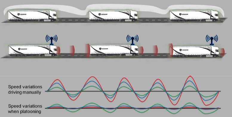 Una dimostrazione pratica di come gli smart service possano configurarsi come High Tech viene ad esempio da Scania. Il settore dei trasporti su gomma è uno dei settori più impattanti dal punto di vista ambientale, in quanto causa principale di traffico, inquinamento, cambiamento climatico e consumo di risorse energetiche non rinnovabili. La connessione del mezzo può essere occasione per conseguire miglioramenti anche ambientali. In particolare, digitalizzare e connettere il mezzo di trasporto consente di dare il via al fenomeno del platooning: degli autocarri interconnessi in un convoglio diventano in grado di seguire, in maniera automatica, un mezzo leader e dunque di emularne l’andamento, accelerando, frenando e sterzando allo stesso modo, mantenendo una distanza fissa e una velocità costante (figura 3).