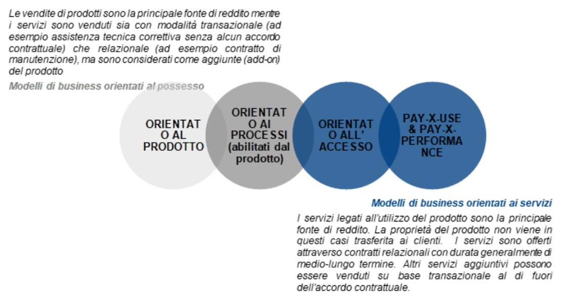 La figura mostra come ci si possa muovere all’interno di modelli di vendita tradizionali, in cui il prodotto core viene venduto al cliente e su questo si appoggia un’offerta di servizi offerti in abbonamento a costo fisso (contratto di manutenzione base o full risk, disponibilità parti di ricambio o SLA garantito in caso di intervento di assistenza). Oppure passare modelli più avanzati, di servitizzazione “pura” (i service oriented business model), dove l’accesso alle funzionalità del prodotto è oggetto di abbonamento e il costo è basato su un driver specifico: la possibilità stessa di accesso, come nel caso del noleggio, o l’intensità di utilizzo (pay-per-use) o la prestazione o risultato ottenuto (pay-per-outcome).
