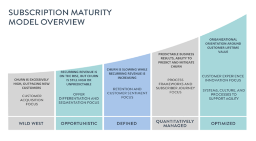 Tra i tanti modi per descrivere il percorso delle aziende verso offerte di subscription, il maturity model in figura, sviluppato da Zuora, evidenzia un passaggio culturale chiave dei modelli di business servitizzati e di quelli basati su subscription in particolare.