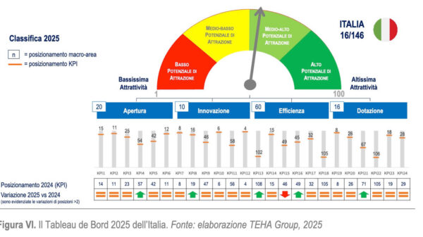 L'Italia sale dal 19° al 16° posto nella classifica dell’attrattività stilata da The European House - Ambrosetti, posizionandosi come Paese a “buona attrattività”. La crescita è trainata dagli investimenti e da un aumento dell'occupazione, ma persistono debolezze strutturali nell'efficienza e nella produttività. USA ancora primi: premiata per ora la Trumponomics. Numeri e riflessioni del Global Attractiveness Index 2025. | | | |