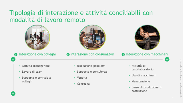 questa è chiaramente la categoria che meno si presta al lavoro a distanza per ragioni evidenti. Tuttavia, in un futuro forse non troppo lontano, le tecnologie digitali potrebbero spingere il lavoro da remoto anche oltre questa frontiera. Pensiamo a un ingegnere che può fare ricerca e sviluppo su digital twin (copie digitali di apparecchiature fisiche), piloti che guidano droni da una stanza, medici in grado di sviluppare diagnosi semplici attraverso delle app o agricoltori che comandano i trattori a distanza attraverso i sensori. Chiaramente in questo campo la linea tra lavoro da remoto e sostituzione del lavoratore è labile, e rimane dunque l’area meno interessante per l’applicazione del modello a distanza.