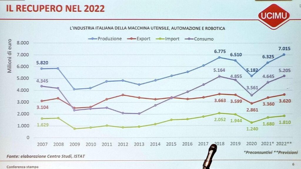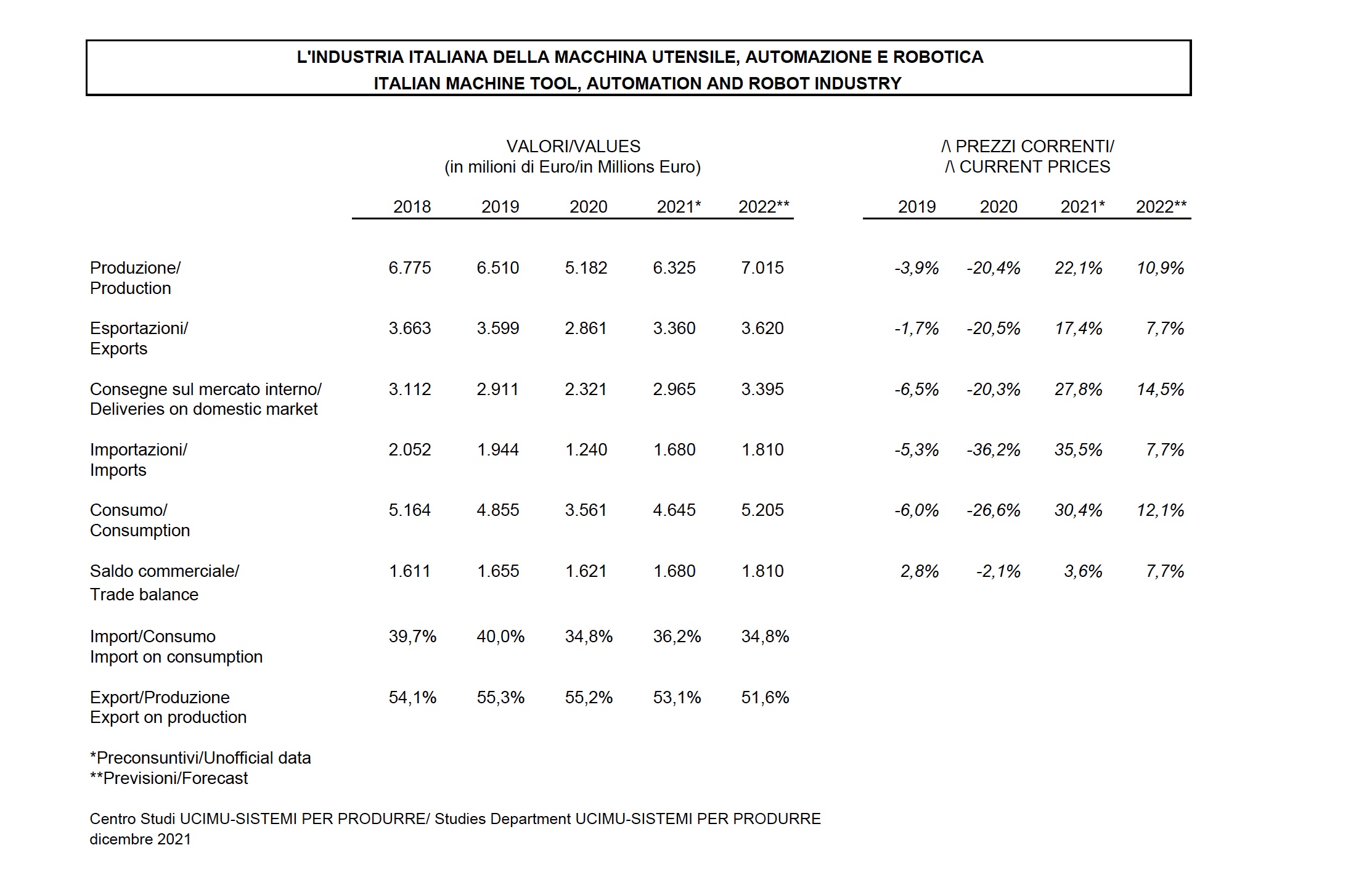 In particolare, secondo le previsioni elaborate dal Centro Studi UCIMU, nel 2022, la produzione crescerà a 7.015 milioni (+10,9% rispetto al 2021), trainata dal recupero delle esportazioni che si attesteranno a 3.620 milioni di euro (+7,7%) e dall’incremento delle consegne dei costruttori sul mercato interno che saliranno a 3.395 milioni di euro (+14,5%).