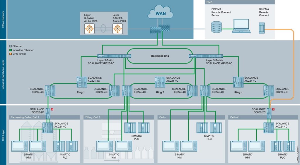 E ad ogni ciclo di innovazione, la quantità di dati scambiati cresce di conseguenza. Per questi motivi, il tradizionale birrificio della Foresta Nera ha dovuto analizzare come procedere. La rete di produzione esistente era già segmentata ma seguiva linearmente le diverse aree del birrificio: partendo dall’immissione del malto, al birrificio, alle cantine di fermentazione, lievito e di stoccaggio, la cantina del filtro e del serbatoio a pressione, l’imbottigliamento, gli ordini così come l’approvvigionamento di energia e l’impianto di trattamento delle acque reflue del birrificio. Con il rischio che in caso di guasto di un dispositivo di rete o di un percorso di trasmissione intermedio, la comunicazione con i dispositivi successivi e per intere aree potrebbe essere compromessa.