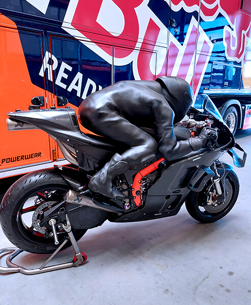 Daniel Marshall, Team Leader Aerodynamics di KTM Motorsports, racconta che la galleria del vento scelta per i test era stata utilizzata per testare automobili e componenti spaziali ma non aveva mai ospitato motociclette e “ci era stato detto che non era possibile effettuare i test con un pilota in sella perché era troppo pericoloso. Per ottenere l’autorizzazione avremmo dovuto eseguire un test di omologazione speciale e installare attrezzature specifiche per proteggere il pilota e garantire la sua sicurezza. L’utilizzo di manichini ci avrebbe permesso di risolvere il problema, proteggendo i nostri piloti da ogni possibile rischio fisico”.