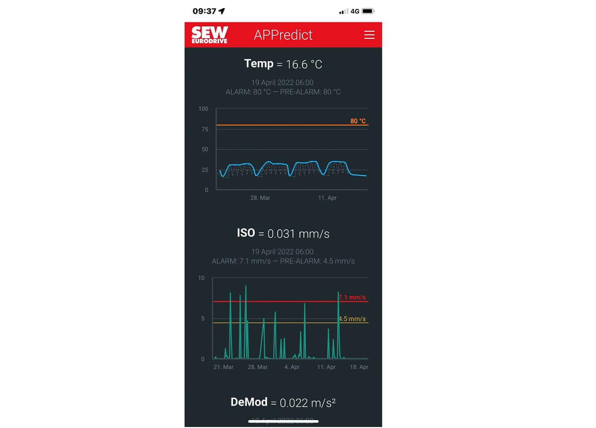 Grazie all’installazione semplice e rapida di sensori wireless direttamente sui riduttori (sia Sew che di terze parti) APPredict permette ottenere informazioni sulla gestione di dati vibrazionali (ISO 10816-1), sulla durata effettiva dell’olio con grafici SEW, sulla temperatura di lavoro e sulle notifiche tramite e-mail e Telegram e la possibilità di esportare tutti i dati in ogni momento da excel.