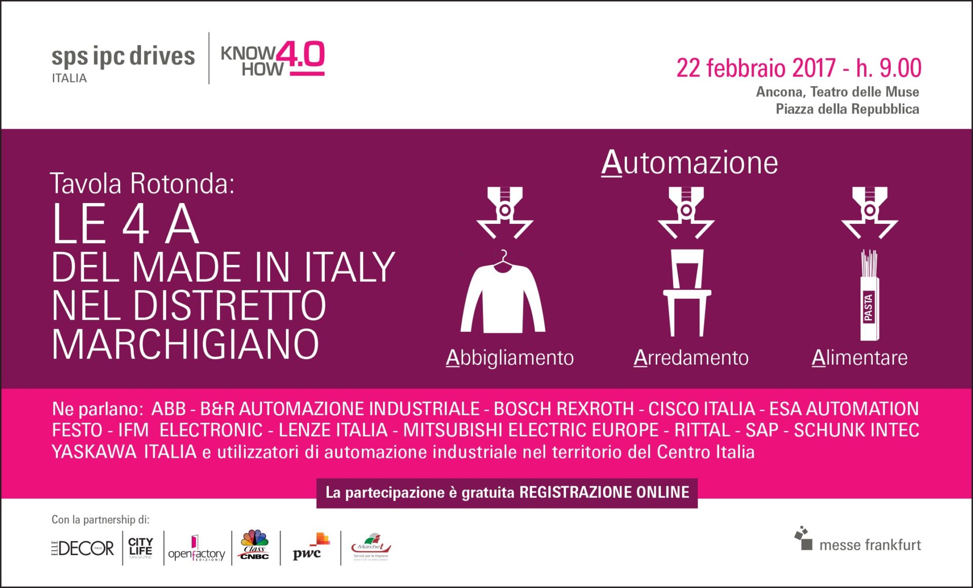 Biesse Group e Scavolini sono alcune delle aziende produttrici locali che presenteranno le loro esperienze, mentre i rappresentanti di alcune tra le più importanti Case fornitrici di soluzioni di automazione – ABB, B&R Automation, Bosch Rexroth, Cisco Italia, ESA Automation, FESTO, IFM Electronic, Lenze Italia, Mitsubishi Electric Europe, Rittal, Schunk Intec, Yaskawa Italia – saranno i protagonisti delle tavole rotonde che tratteranno di problematiche legate ai settori alimentari, arredamento e abbigliamento.