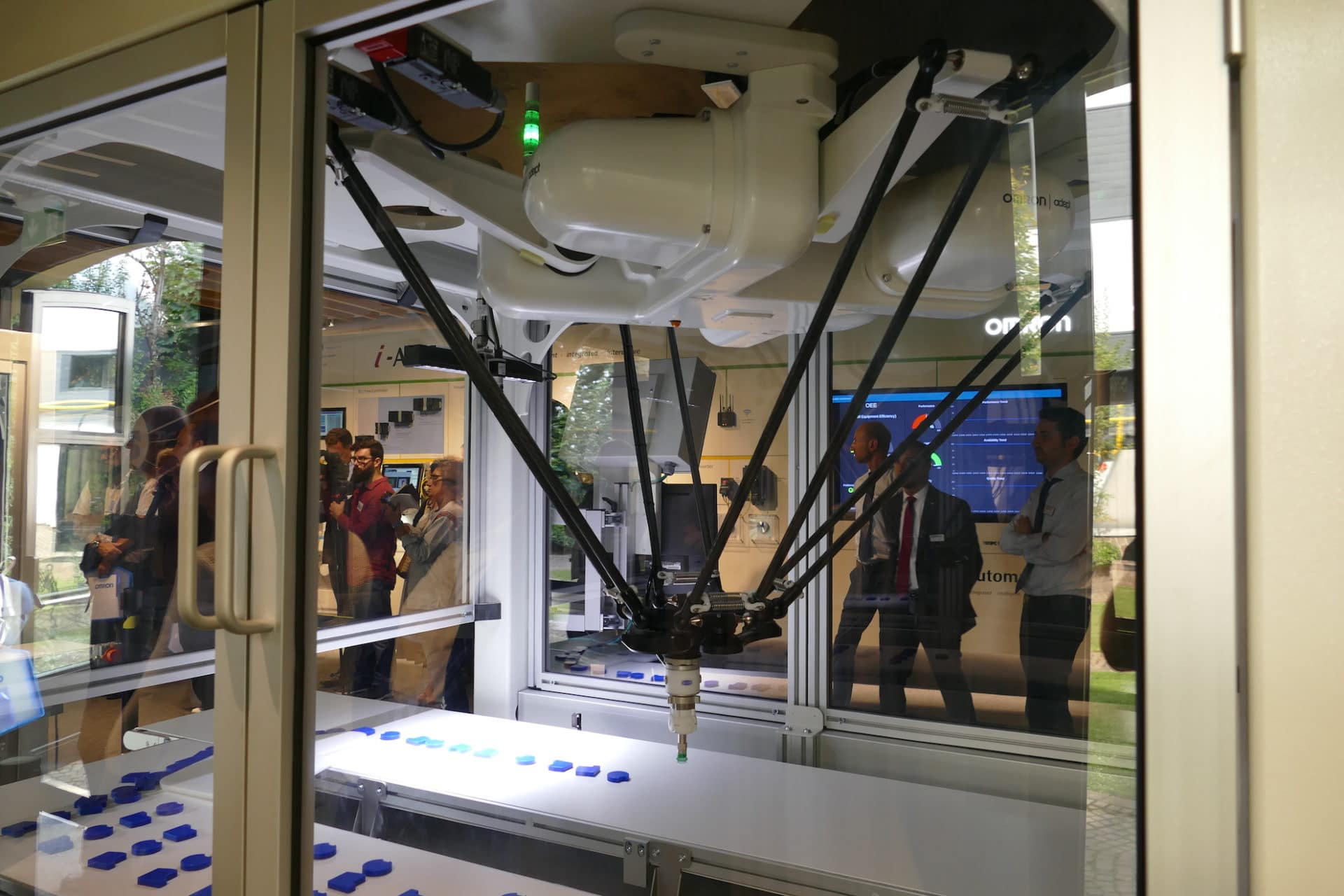 Di fronte alla parete dimostrativa ci sono tre celle nelle quali Omron mette in mostra tutte le sue tecnologie robotiche: dagli antropomorfi agli Scara, fino ai Delta.