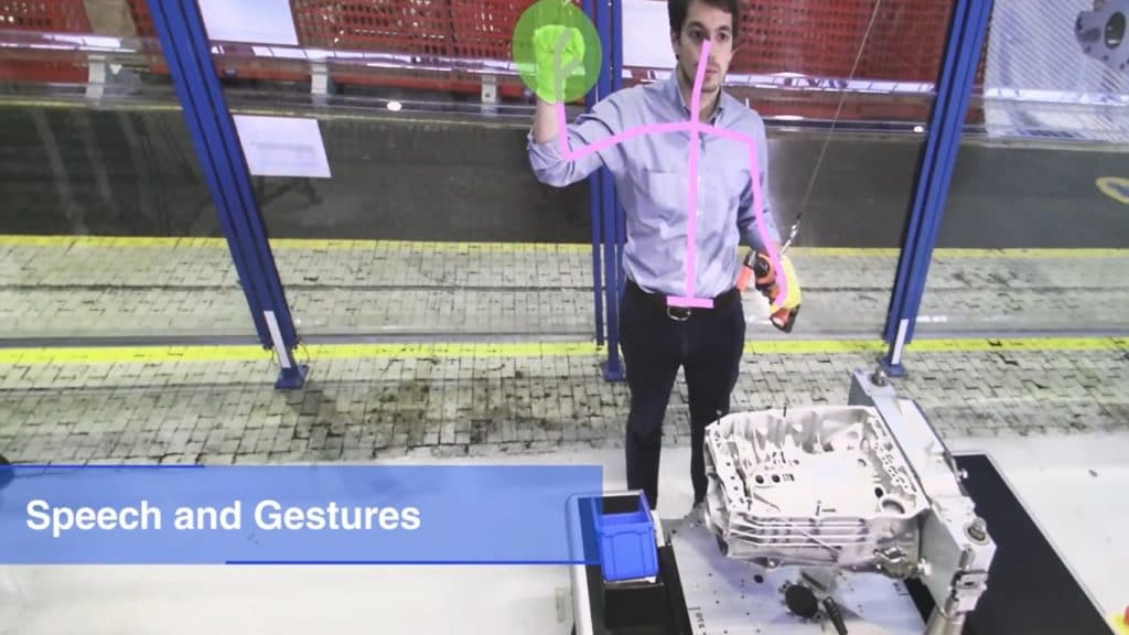 L’operatore e Vir.Gil interagiscono in vari modi: su uno schermo compaiono applicazioni e istruzioni da seguire, e l’uomo può comunicare con la macchina sia a voce sia con gesti codificati, che Vir.Gil ‘vede’ attraverso l’occhio digitale targato Smart Robots e sa interpretare: c’è un segnale per indicare l’inizio delle operazioni, uno per interromperle, un gesto per passare ad altri compiti, e via dicendo.