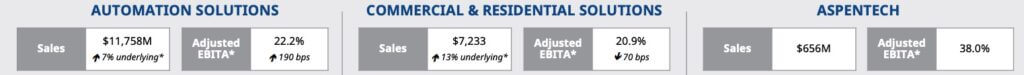 Le aree di business sono: Electrification (14,84 miliardi di dollari), Motion (7,814 miliardi di dollari), Process Automation (6,27 miliardi di dollari) e Robotics & Discrete Automation (3,64 miliardi di dollari).