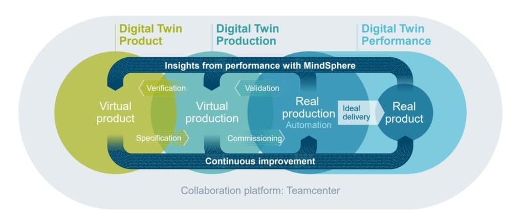 Il Digital Twin è il concetto che, più di tutti, incarna la visione di Siemens: si parte da un’idea di prodotto sviluppata sfruttando le tecnologie digitali (PLM) per poi creare, sempre in maniera virtuale, anche il relativo sistema di produzione. Poi si passa alla fase del commissioning e si calano questi progetti nel mondo reale, realizzando sistemi di produzione e prodotti. Ma il ciclo non si conclude qui: dalla realtà produttiva così realizzata vengono estratte tutte le informazioni rilevanti, che vengono riportate nel modello virtuale al fine di massimizzare le performance nell’ottica del miglioramento continuo.