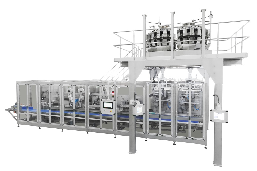 Il risultato è stato ottenuto grazie alla particolare struttura della macchina, nella quale 2 confezionatrici verticali continue di tipo box-motion sono montate sopra un nastro a settori ad avanzamento intermittente e vengono alimentate da un doppio sistema di pesatura, costituito da una pesatrice multitesta modello Infinity.